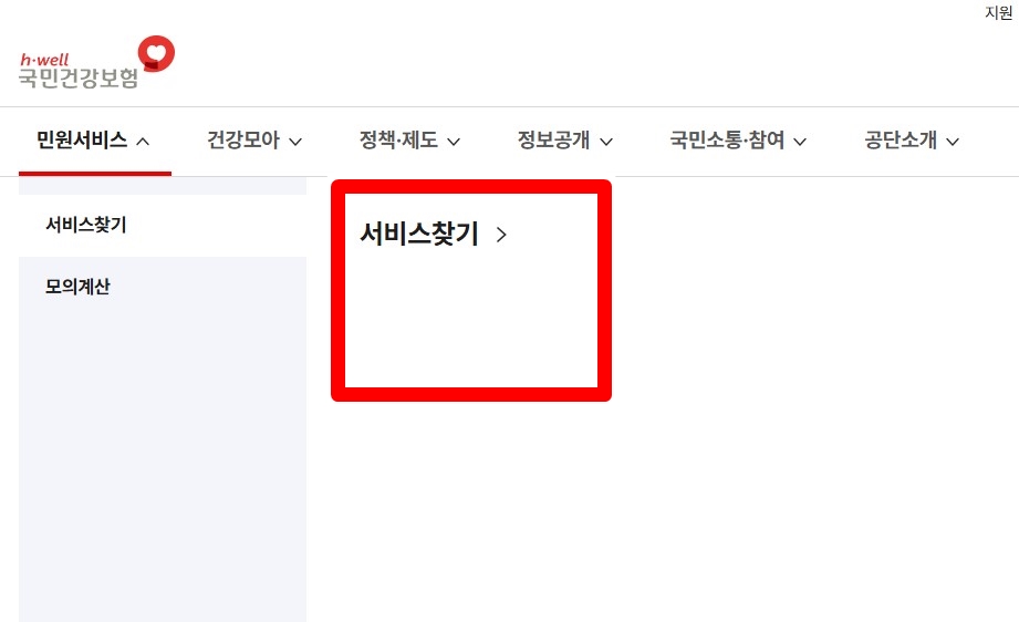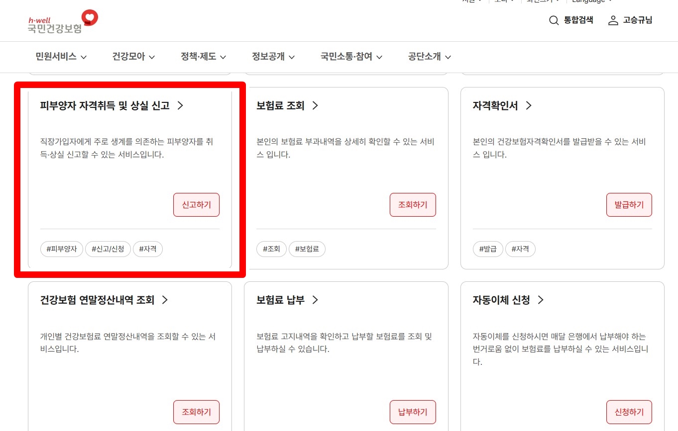 - [민원서비스] → [서비스찾기] → ‘피부양자 자격 취득 및 상실 신고’ 클릭