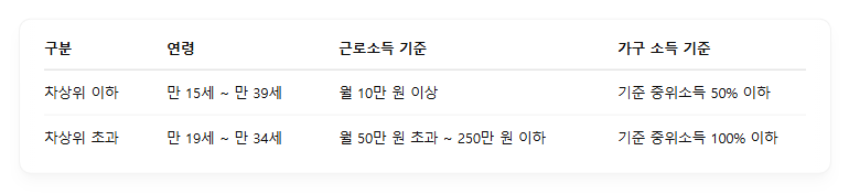 신청 가능한 대상자는 연령 + 소득 수준 + 가구 기준을 모두 충족해야 합니다. 신청 대상은 ‘차상위 이하’와 ‘차상위 초과’로 나뉘며, 연령 및 소득 기준이 조금씩 다릅니다.