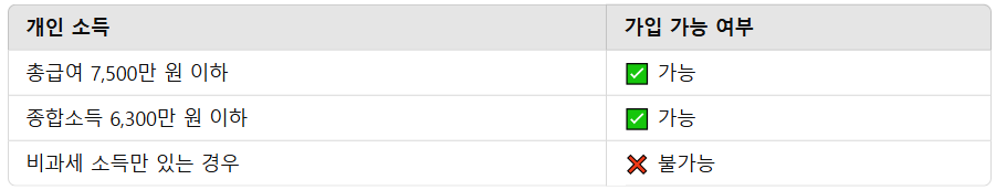 🔹 금융소득: 최근 3년간 금융소득종합과세 대상자(이자·배당소득 연 2천만 원 초과)가 아닐 것