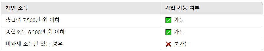 🔹 금융소득: 최근 3년간 금융소득종합과세 대상자(이자·배당소득 연 2천만 원 초과)가 아닐 것
